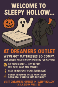 Visit Dreamers Outlet in “Sleepy Hollow” (Better known as Sioux Falls, SD) and discover deals that’ll make your nightmares disappear.