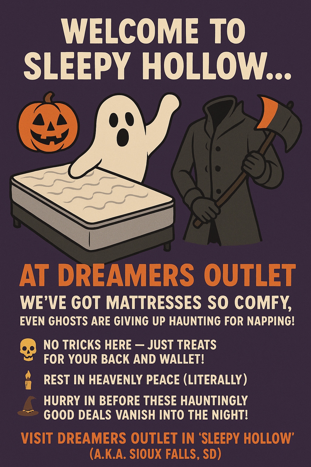 Welcome to "Sleepy Hollow"… where even the Headless Horseman stops for a good night’s sleep! At Dreamers Outlet, we believe spooky season shouldn’t mean sleepless nights. Whether you’re haunted by bad springs or restless dreams, our mattresses are so comfy it’s scary!...